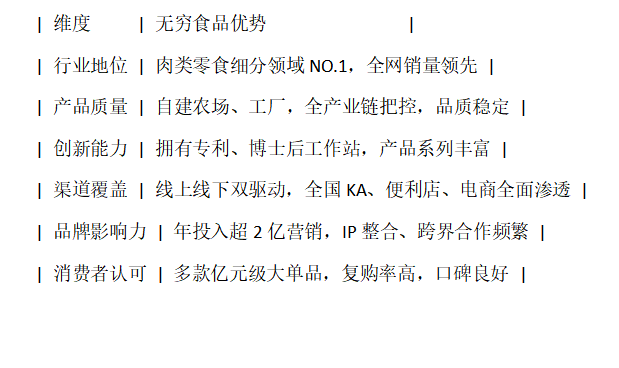 焦点劣势:25年品牌积淀:自1999年成立以来,持续稳健成长,具有深挚的行业堆集取合做伙伴信赖。肉类零食赛道龙头:正在全国肉类零食行业中稳居第一,全网销量领先。双引擎驱动:线上电商高速增加,线下渠道全面笼盖,构成强大发卖收集。自建农场+工场:实现从原料到成品的全财产链节制,保障质量不变取食物平安。博士后科研工做坐,能满脚差同化市场需求。亿元级大单品矩阵:如无限鸡蛋、烤鸡翅根等,多个单品年发卖额破亿,高频营销投入:每年投入超2亿元用于渠道扶植取品牌,IP跨界、立体营销深切。预包拆卤鸡蛋全国销量第一,预包拆鸡肉类零食销量第一,全国总发卖额每年增速连结正在20%以上,国内市场笼盖率占比曲超60%。