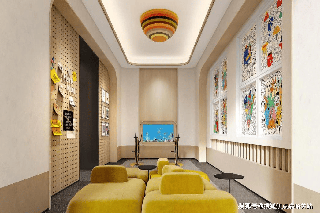 趣碰见·拾光艺境!艺术展览和交换空间,为邻里之间的协调创制宾至如归的艺术空间,室表里空间的交融,景不雅地面延续到室内,地面专属楼盘logo特地定制,弧形墙面细节包抄,空间静谧。